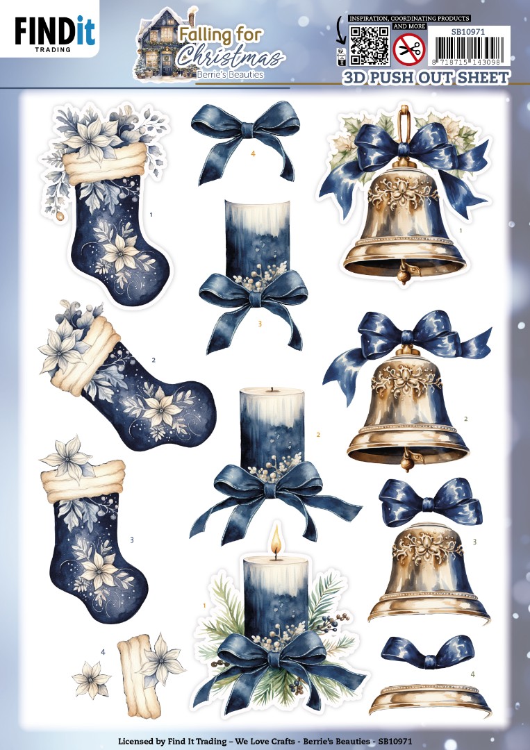 Stanzbogen mit drei 3D-Bildern zum Thema der Falling for Christmas -Kollektion von Berries Beauties.