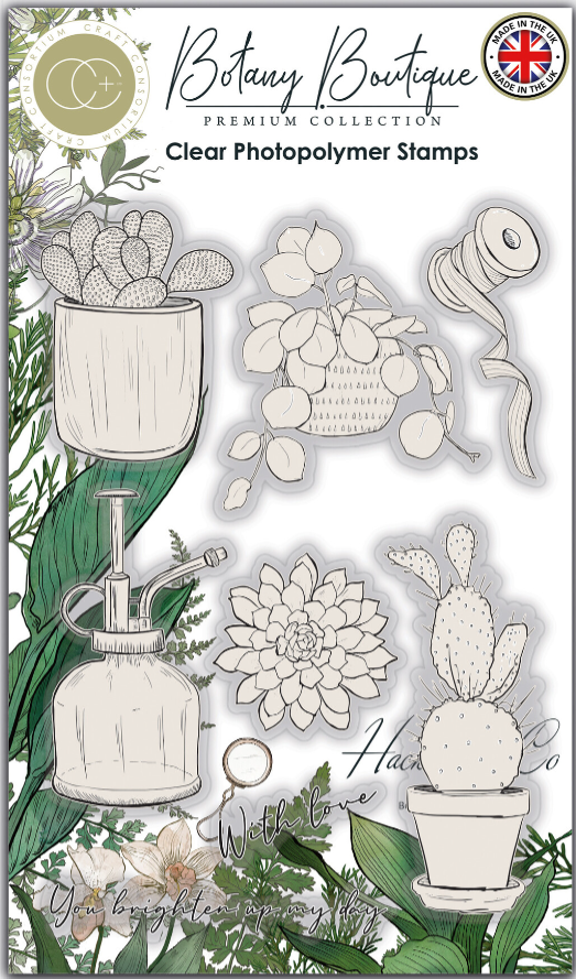 Craft Consortium are delighted to announce the exclusive launch, of their brand-new premium collection, designed in partnership with world renown, award winning illustrator, Katy Hackney of Hackney & Co. Introducing; 'Botany Boutique'. Botany Boutique is the exquisite, thirteenth instalment in our exclusive partnership, covering a hand illustrated collection of on trend, delicately drawn florals, house plants and succulants. Supported by a series of coordinating premium photopolymer stamps and embellishments, this collection is truly one not to be missed and combines an array of exquisit art work to create beautiful projects all year round. A set of 8 premium clear photopolymer stamps in coordinating designs. With protective acetate film printed with outline references, made in the UK.