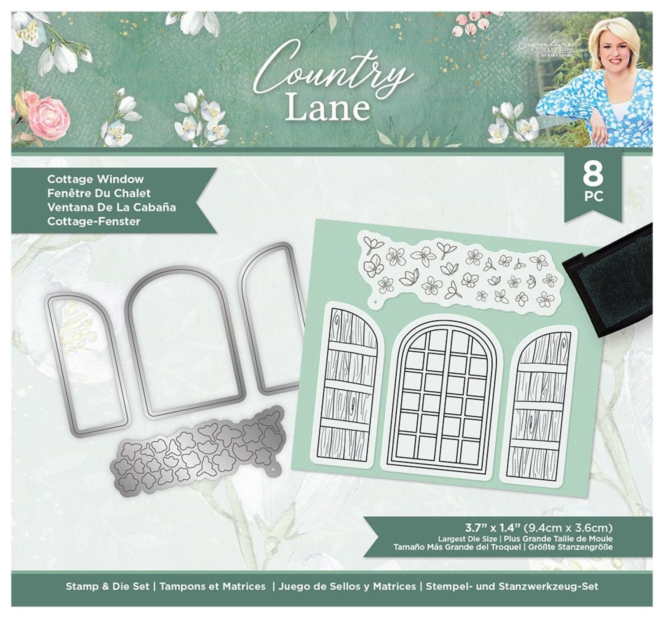 Escape the hustle and bustle of everyday life and breathe fresh country air into your cards and crafts with the Sara Signature Country Lane Collection. This papercraft collection invites you to take off your shoes and walk barefoot through the grass, admiring the natural splendour that graces the meadows and hedgerows of a quiet country lane. With rustic cottage windows and doors, heirloom-style embellishments, 3D peonies and dreamy watercolour florals this papercraft range encourages makers of all abilities to celebrate the glory of the natural world through cardmaking and crafts. The Cottage Window set includes 2 stamps and 2 dies to create a rustic style arched window with wooden shutters and a cloud of sweet flowers to surround it. Create different effects with this versatile set! You can have the shutters open or closed, use 3D foam pads to add extra dimension to the shutters, or use a craft knife to create an aperture in the window and acetate behind for a realistic effect. All you need is a die-cutting machine, a die and your chosen card or paperstock. Simply create your plate combination using the helpful Sandwich Guide in the instruction manual and run through your die-cutting machine - it’s that simple! The stamps are made from the highest quality clear acrylic, which means that you can see straight through the stamp to line up the image accurately. Just adhere your chosen stamp to an acrylic block or Rock-a-Block and stamp away! This means that you're guaranteed accurate impressions every time. Stamps, dies, beautiful lace ribbon, and stunning paper pads with a palette of warm pastoral greens, rose pinks and soft blue. Take a stroll through the Sara Signature Country Lane Collection to bring the joy of the outside into your cards, crafts, gift bags and more! 9,4 x 3,6 cm (größte Stanzschablone)