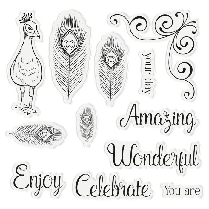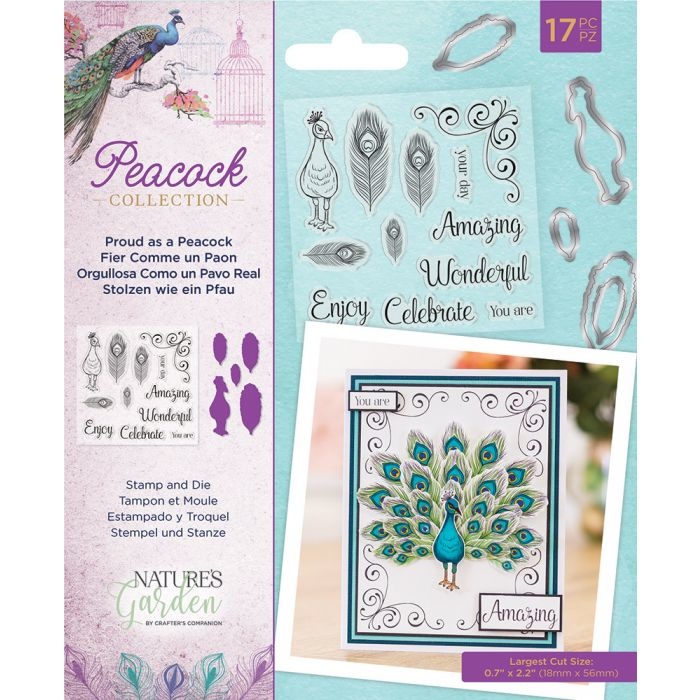 Add some Peacock elegance with this pretty "Proud as a peacock" stamp and die collection. Pack includes 17 pieces, Largest cut size - 0.7 x 2.2 inches, Stamp & Die