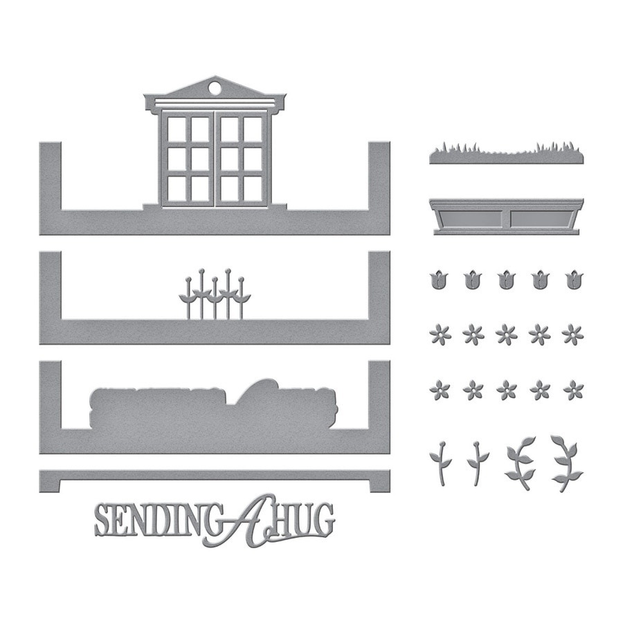 Approximate Size: Top Insert Frame: 4.70 x 1.26 in./11.90 x 3.20 cm; Bottom Insert Frame: 4.70 x 0.31 in./11.90 x 0.80 cm; Window Insert: 4.10 x 1.80 in./10.40 x 4.60 cm; Sending A Hug Outline: 4.16 x 0.77 in./10.60 x 2.00 cm; Sending A Hug Sentiment: 3.22 x 0.74 in./10.60 x 2.00 cm; Window Box Flower Insert: 4.10 x 0.68 in./10.40 x 1.70 cm; Window Box: 0.50 x 2.07 in./1.30 x 5.30 cm; Grass: 2.07 x 0.31 in./5.30 x 0.80 cm; Vines (2 pcs): 0.68 x 0.58 in./1.70 x 1.50 cm; Stems (2 pcs): 0.61 x 0.31 in./1.50 x 0.80 cm; Tulips (5 pcs): 0.27 x 0.26 in./0.70 x 0.60 cm; Small Vine Flowers (5 pcs): 0.30 x 0.30 in./0.70 x 0.70 cm; Mini Vine Flowers (5 pcs): 0.28 x 0.28 in./0.70 x 0.70 cm.