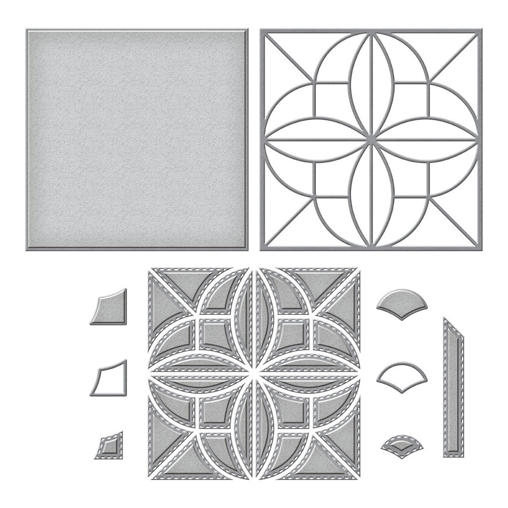 Patchwork Petals Etched Dies is from the Home Sweet Quilt Collection by Becca Feeken. It includes a set of seven thin metal dies which creates a lovely floral pattern. Each section has a solid/outline shape and a stitched insert to match. Home Sweet Quilt is a collection of patterned dies, embossing folder and clear stamps all inspired by beautiful handmade quilt designs. Becca Feeken introduces this lovely offering for crafters to create heartwarming cards, scrapbook pages, and more. Approximate Size: Outer Square Outline: 4.25 x 4.25 in./10.80 x 10.80 cm; Quilt Square Insert: 4.15 x 4.15 in./10.50 x 10.50 cm; Half Oval Stitched Insert (8 pcs): 0.35 x 1.89 in./0.90 x 4.80 cm; Pointed Square Stitched Insert (4 pcs): 0.89 x 0.89 in./2.30 x 2.30 cm; Partial Half Circle Stitched Insert (8 pcs): 0.96 x 0.91 in./2.40 x 2.30 cm; Corner Triangle Stitched Insert (8 pcs): 1.59 xc 0.87 in./4.10 x 2.20 cm; Scallop Layer Outline: 0.76 x 0.76 in./1.90 x 1.90 cm; Scallop Layer Stitched Insert: 0.62 x 0.62 in./1.60 x 1.60 cm; Corner Layer Outline: 0.71 x 0.71 in./1.80 x 1.80 cm.