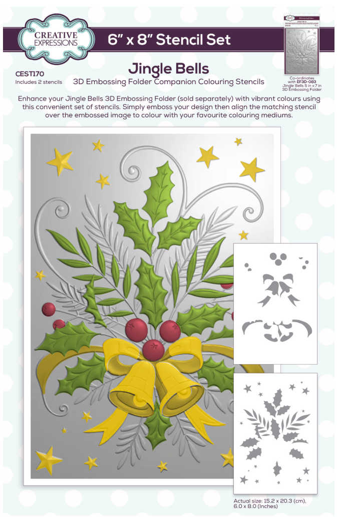 Enhance your Jingle Bells 3D Embossing Folder with colour using this convenient companion colouring stencil set. Simply emboss your design then align the stencils over the embossed image and colour with your favourite colouring mediums! Whether you prefer Cosmic Shimmer polishes, inks, paints, misters, pastes, glitter, or more, this stencil is perfect for your creative needs. It's ideal for various paper crafting projects, including cardmaking, scrapbooking, and more. Crafted from durable 350-micron mylar, this stencil is built to last. It is resistant to solvents and easy to clean, ensuring its longevity and usability. Made In UK. 2 stencils. Size 6 in x 8 in (15.2 cm x 20.3 cm).