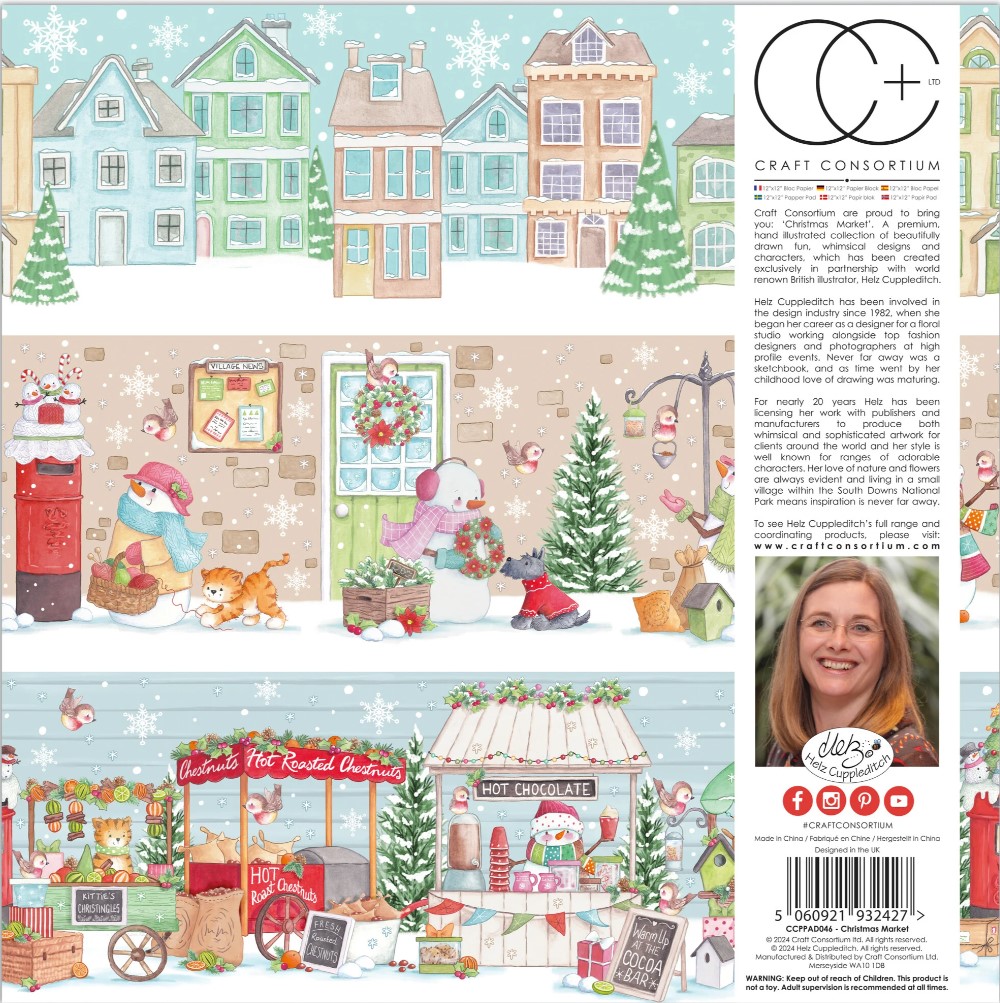 Craft Consortium is delighted to announce the exclusive launch, of our brand-new premium collection, designed in partnership with Helz Cuppleditch. Introducing; 'Christmas Market'. 'Christmas Market' is the fifteenth instalment in our exclusive partnership, covering the most adorable, hand illustrated whimsical Christmas characters, and elements and bold iconic colours which Helz Cuppleditch is renowned for. Supported by a series of coordinating embellishments and photopolymer stamps, 3D Decoupage and much more, this collection is truly one to cherish. Premium 12"x12" gummed paper pad (30.5 x 30.5cm), the pad containing 30 double sided sheets in heavyweight 200gsm, acid free cardstock. Ideal for die-cutting and distressing. Desiged exclusively in partnership with world renown illustrator Helz Cuppleditch.