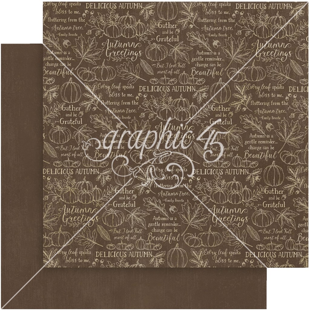 Autumn Greetings 12×12 Patterns & Solids Pack. 16 double-sided sheets - 12×12-inch papers - 2 each of 8 designs. Made in the USA - cover-weight papers are acid and lignin free. This collection is perfect for scrapbook layouts, mini albums, folios, planners, card making, and off-the-page home decor projects. Autumn Greetings - G45 Paper Collection. Embrace the cozy charm of the season with Graphic 45's new "Autumn Greetings" paper collection. This enchanting assortment captures the essence of fall through a rich and subdued color palette featuring olive green, burgundy, mocha brown, and a pop of orange. Delight in the whimsical imagery of adorable woodland animals, intricately designed fall leaves, and creamy pumpkins that evoke the warmth and beauty of autumn. Perfect for all your seasonal crafting needs, "Autumn Greetings" brings a touch of nature's splendor to your creative projects.