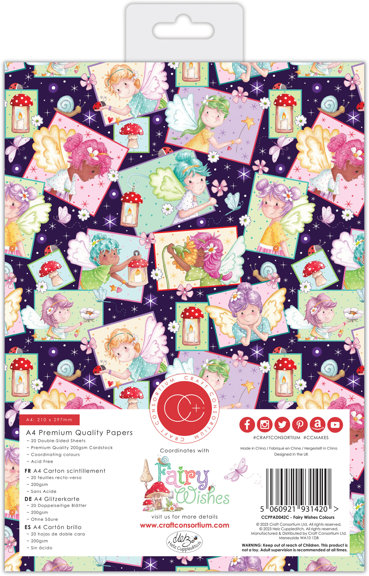 Premium A4 gummed cardstock pad. The pad contains 20 double sided sheets in heavyweight 200gsm, acid free cardstock. Ideal for, layering, die-cutting and distressing. The colours have been specifically selected to coordinate with the Fairy Wishes collection. Designed exclusively in partnership with award winning British illustrator Helz Cuppleditch. 20 doppelseitige Papiere, 200 Gramm Papier