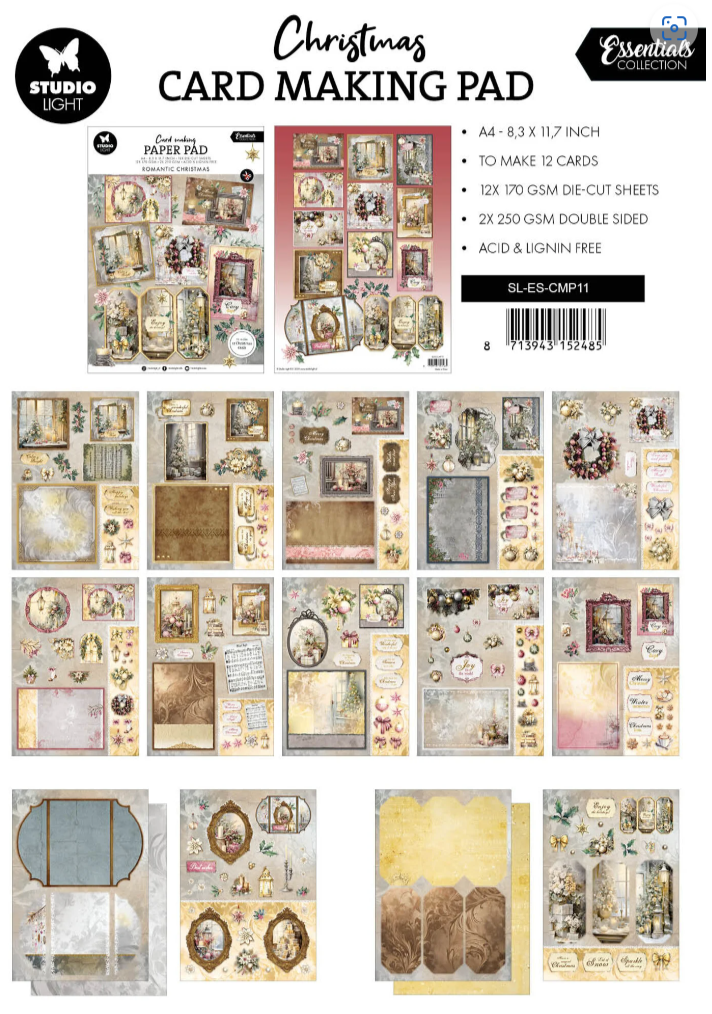 Christmas Essentials by Studio Light. Card Making Pad. A4 / 8.3 x 11.7 inch. To make 12 complete cards. 170/250 gsm cardstock. Acid and lignin free.