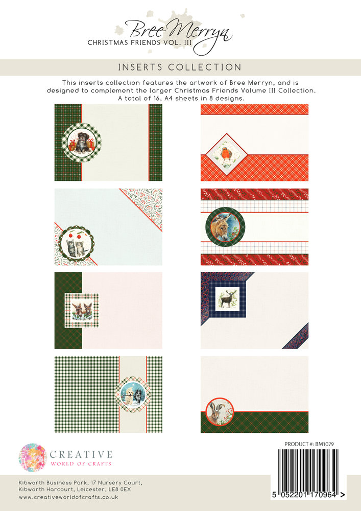 Bree Merryn Christmas Friends Vol 111 - Insert Collection - The A4 insert pad features artwork by Bree Merryn featuring 8 pieces of artwork from the Christmas Friends Collection sixteen A4 sheets in eight different designs. Having studied for many years as a figurative artist Bree has a real flair for capturing both the character and detail of her subjects. All of the animals she paints have their own name and personality. Paper weight 120gsm. The Collection includes - A4 Decorative Papers (BM1076), Die-cut Collection (BM1080), Insert Collection (BM1079), Essentials Colour Card (BM1077), Toppers (BM1078).