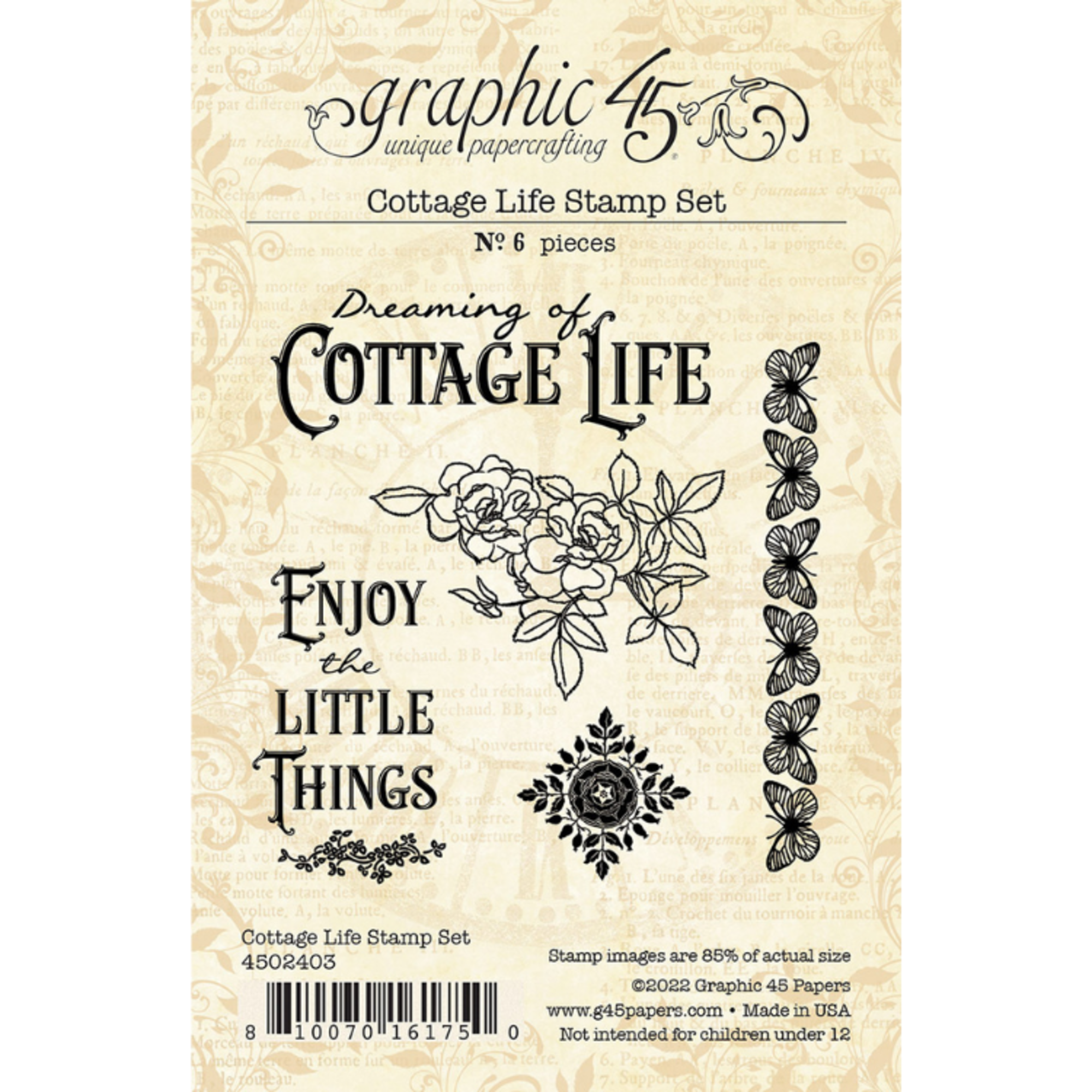 Stempelset mit 6 Stempeln, Cottage Life Stamp Set. 6 photopolymer stamps. Made in the USA. Use the stamps with an acrylic block and inks of your choice. Graphic 45’s Cottage Life will transport you to an English countryside garden full of periwinkle blue forget-me-nots and blush pink roses. Images of charming cottages will have you dreaming of living the simpler life.