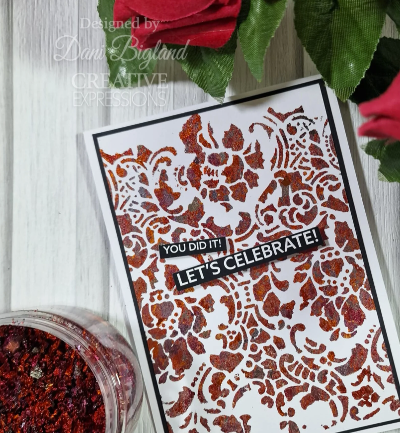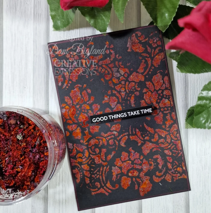 Create metallic effect backgrounds and highlights using these hand cut flakes. Apply with Cosmic Shimmer Flake & Glitter glue, on double sided sheets or tape. Buff with our specialist sponge to give a smooth shiny finish. Each pot contains 100ml of uniquely cut pieces.