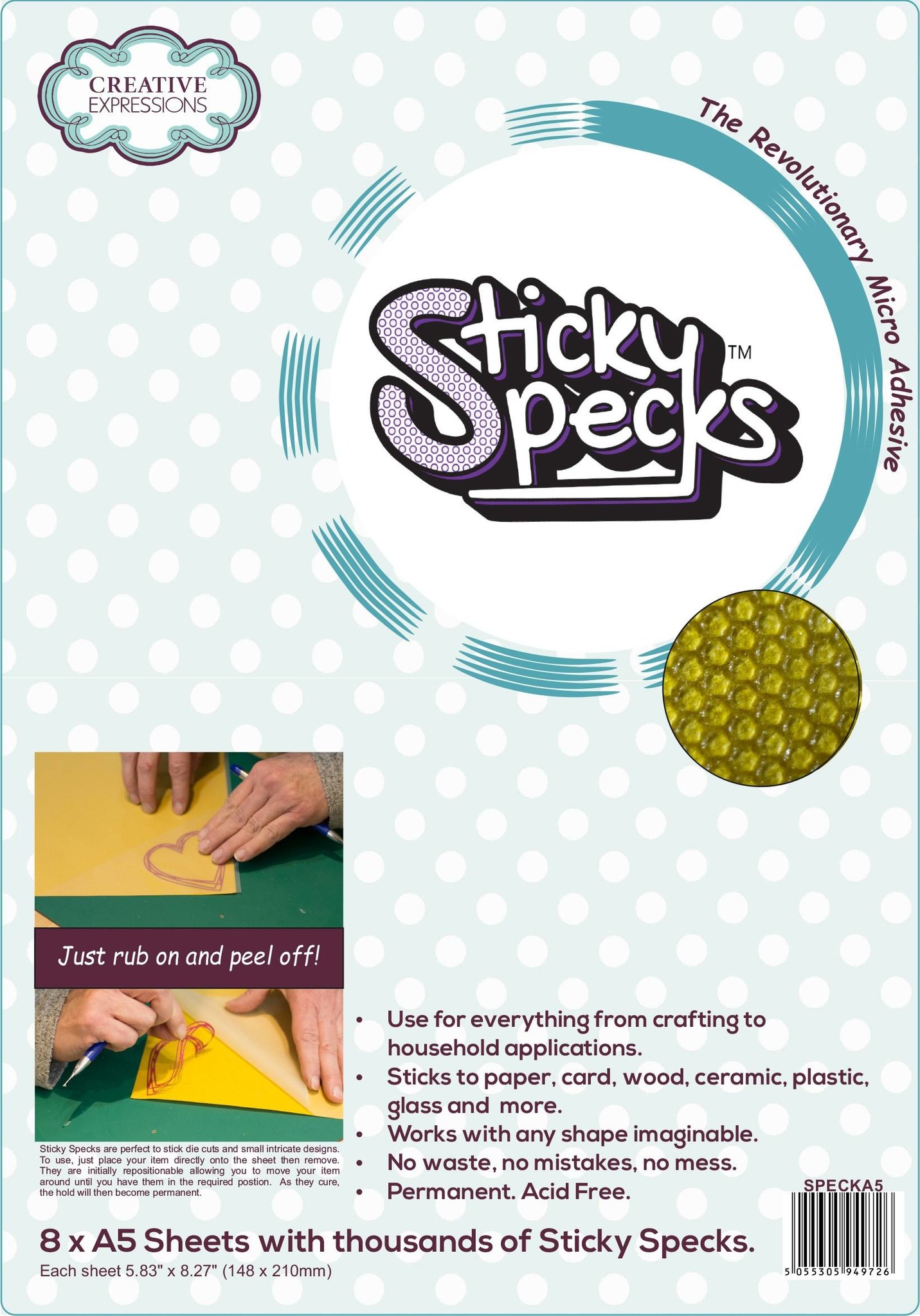 Sticky Specks Micro Adhesive Sheets are a perfect addition to your crafting stash. Use for everything from crafting to household applications. Sticks to paper, card, wood, ceramic, plastic, glass and more. Works with any shape! No waste, no mistakes, no mess. Permanent and acid free. 8 x A5 sheets with thousands of Sticky Specks!
