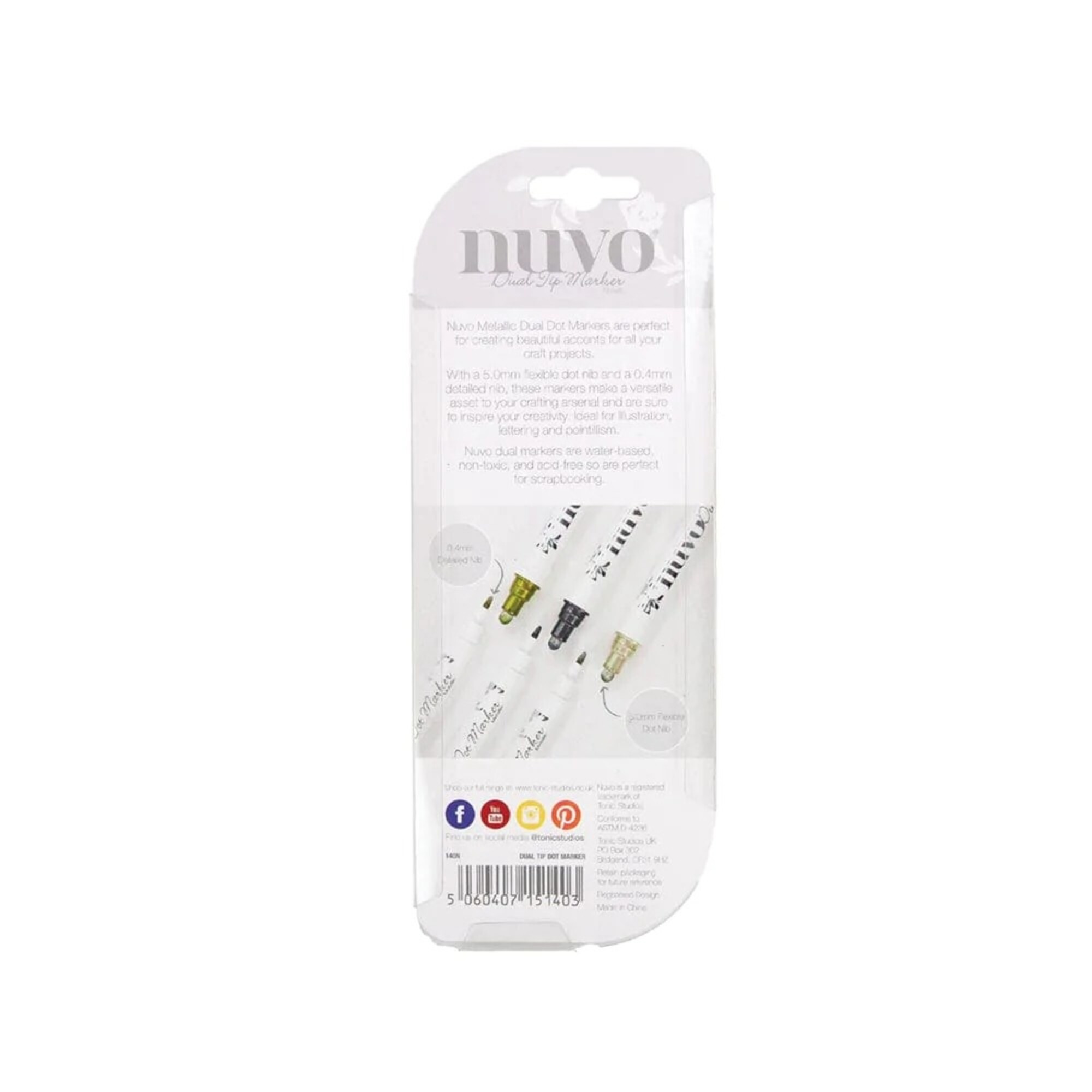 Nuvo Metallic Dual Dot Markers are perfect for creating beautiful accents for all your craft projects. With a 5.0mm flexible dot nib and a 0.4mm detailed nib, these markers make a versatile asset to your crafting arsenal and are sure to inspire your creativity. Ideal for illustration, lettering and pointillism. Nuvo dual markers are water-based, non-toxic, and acid-free so are perfect for scrapbooking.