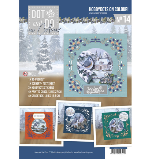 Einzigartig an diesem kompletten Hobbydots-Set ist, dass das Muster auf dunklem Karton gedruckt ist. Das Set enthält Material für 4 vollständige Karten: drei ausziehbare 3D-Bilder, 1 Scenery- / Textblatt, drei Bögen mit Hobbydots-Stickern, vier Blätter Card Deco-Karton, vier vorgedruckte Auflegekarten und vier Auflegekarten zum Fertigstellen. Aufgrund der vorgedruckten Muster kann das Set ohne Leuchtkasten verwendet werden.
