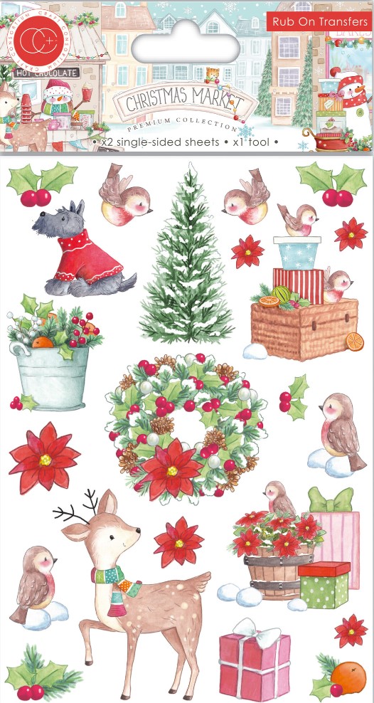 Craft Consortium is delighted to announce the exclusive launch, of our brand-new premium collection, designed in partnership with Helz Cuppleditch. Introducing; 'Christmas Market'. 'Christmas Market' is the fifteenth instalment in our exclusive partnership, covering the most adorable, hand illustrated whimsical Christmas characters, and elements and bold iconic colours which Helz Cuppleditch is renowned for. Supported by a series of coordinating embellishments and photopolymer stamps, 3D Decoupage and much more, this collection is truly one to cherish. A set of 2 sheets of rub-on transfers which also includes a rub-on tool. (Sheet Size 185mm x 125mm).