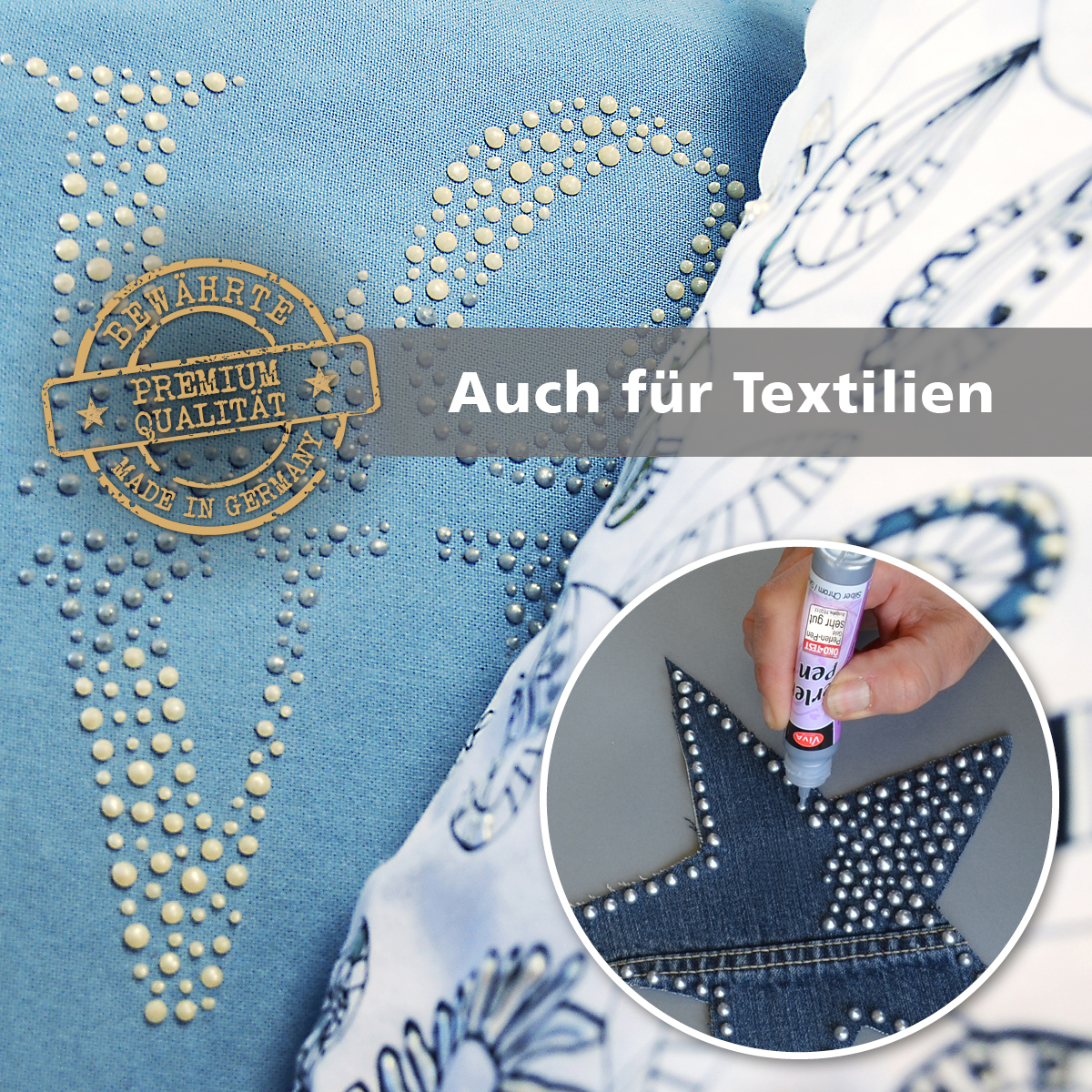 Schimmernde Perlen auf Ihren Textilien und vielem mehr. Mit dem Perlen-Pen gestalten Sie wunderschöne Ornamente aus kleinen und großen Perlen. Die Größe der Perle erreichen Sie einfach und problemlos durch mehr oder weniger Druck auf den Pen.