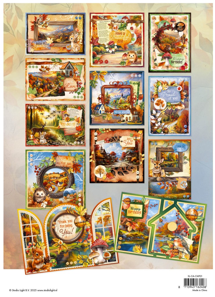 Charming Autumn by Studio Light. Card Making Pad Autumn Cards. To make 12 autumn cards. A4 / 8.3x11.7 inch. 12 die-cut sheets - 170 gsm, 115#. 2x 250 gsm, 169#. Acid & lignin free. Complete size: 210x294x4mm. Content: 14 Sheets.