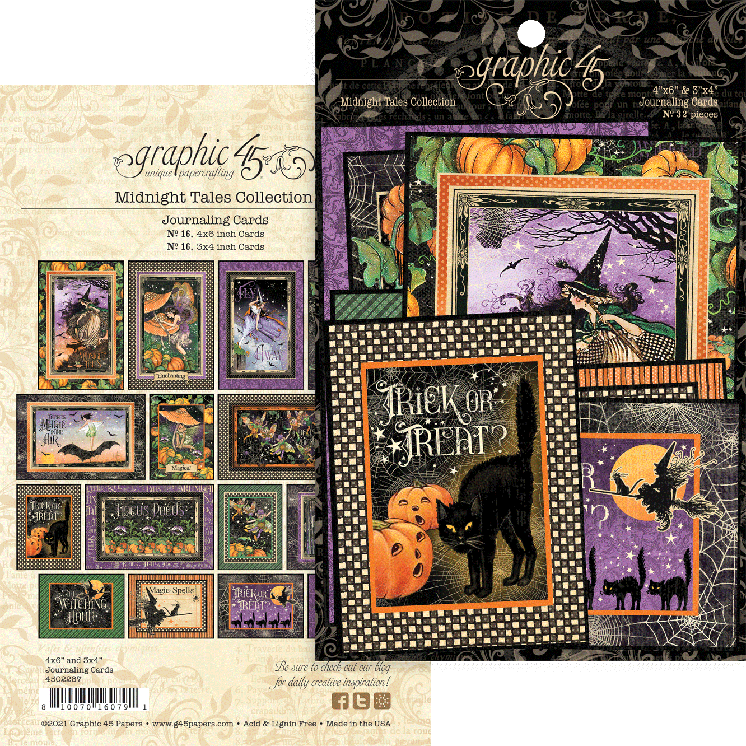 Each pack includes: 32 individual journaling & ephemera cards 2 each of 16 designs. (16) 4 x 6-inch & (16) 3x4-Inch. Made in the USA. Cover-weight papers are acid and lignin free. Graphic 45’s latest paper collection is a magical Halloween fantasy, full of wickedly wonderful witches, festive orange pumpkins and superstitious black cats. You’ll be mesmerized by the saturated color palette of golden oranges, garden greens, dreamy purples, charcoal blacks and delicate creams. It’s the perfect collection to bring an authentic vintage look to any spooky craft creation!